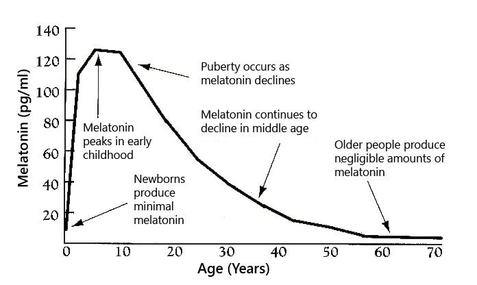 Melatonin is a natural sleep hormone produced in the body. Multiple scientific studies have been performed on melatonin. The general medical consensus is that melatonin may help some people who suffer from jet lag or the inability to fall asleep.1 Melatonin production drops significantly as we age, as can be seen on the chart to the right. Therefore, older populations may benefit more from melatonin supplementation than younger ones.